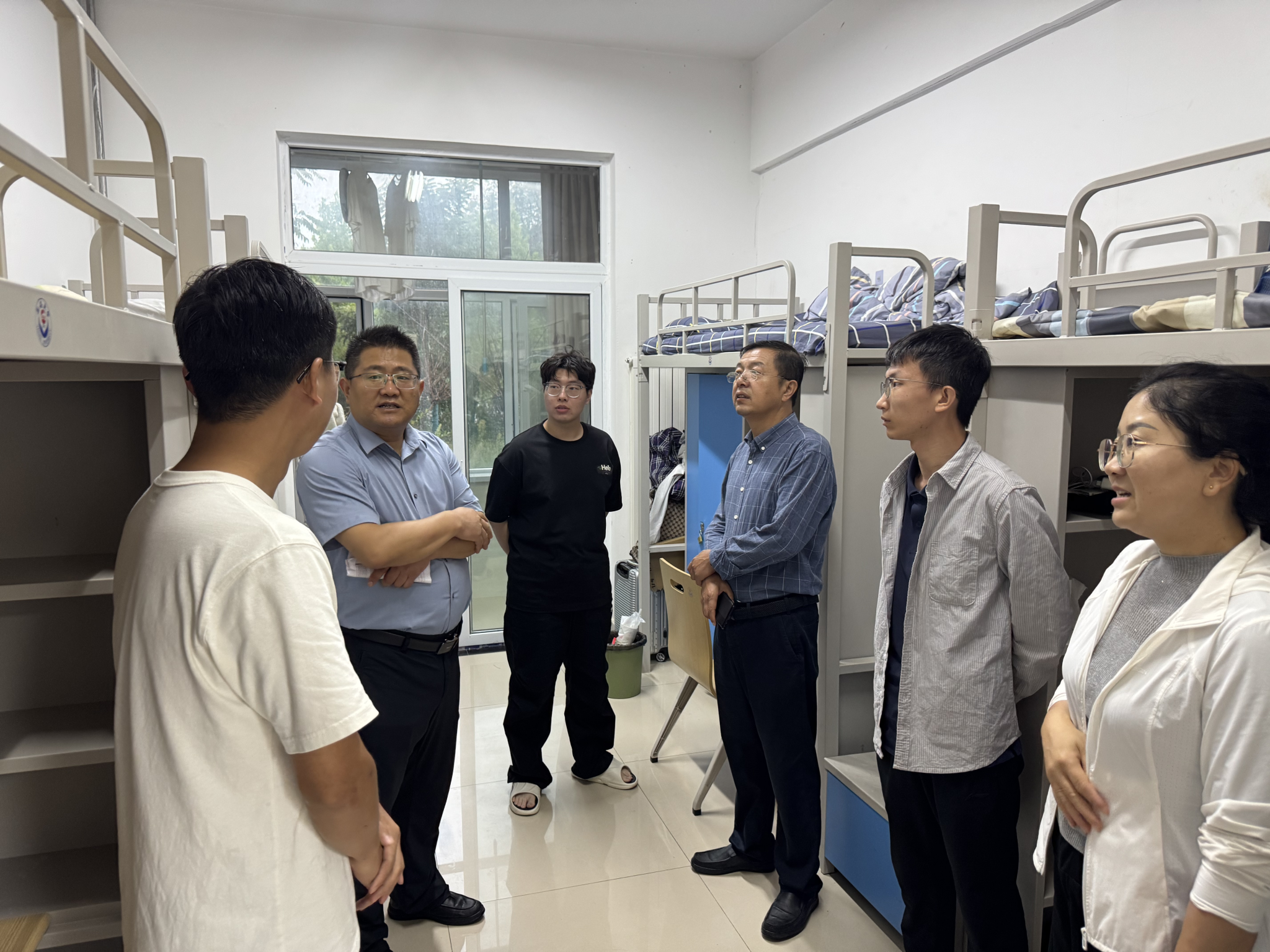 9月2日下午,公司党委书记杜林渊,经理王保存,党委副书记刘艳,副经理白中阳,辅导员王海泉一行走进2025级新生宿舍,开展走访慰问活动。公司领导依次走进各研究生宿舍,关心同学们入校以来的适应情况,对于同学们提出的各类生活设施、后勤服务等问题,院领导予以耐心解答并协调处理,切实为新生解决实际困难。